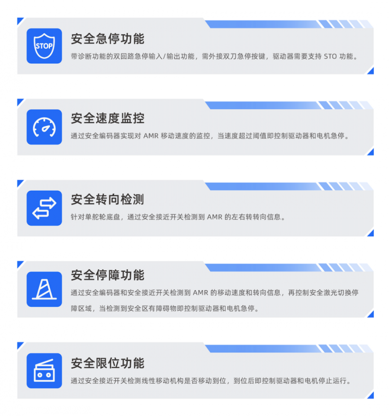這就意味著通過 SRC-3000FS,無需安全“PLC”,即可搭建滿足 ISO 3691-4 國際安全標準的 AMR!由 SRC- 3000FS 打造的 AMR 性能強悍的同時空間更加緊湊,這不僅降低造 AMR 的難度,還能為客戶提供更多樣的造車選擇,為國產(chǎn) AMR 提供強有力的技術(shù)支持,促進 AMR 行業(yè)繁榮發(fā)展!