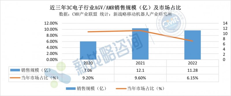 根據CMR產業聯盟數據,新戰略移動機器人產業研究所統計,2022年3C電子行業占工業應用移動機器人整體銷售市場的6.15%,市場規模約為11.28億元,相較于2022年略有下降。