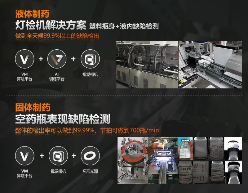 質(zhì)量安全永遠是制藥領(lǐng)域的第一要求。在液體及固體制藥領(lǐng)域,通過高分辨率面陣相機與深度學(xué)習(xí)AI算法的結(jié)合,海康機器人提供的機器視覺解決方案能夠精準檢測瓶身外觀缺陷及液內(nèi)異物,大幅提升檢測準確率與效率,同時保障檢測人員的健康安全。